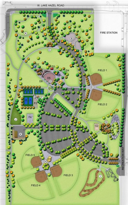 The park’s features include a playground and splash pad; a sand and water play area; dual zip lines, roller slides, and a small climbing wall. Its Active Area featuring six pickleball courts and two tennis courts dual-striped for pickleball; bocce ball courts; a 40-yard dash challenge; and basketball courts. The park’s Teen Area has a skatepark, a sand volleyball court, hammock poles, and a shelter with WiFi. The park's attractions also include a bike park and pump track; three additional softball fields (two of which can be illuminated for nighttime play); public art pieces and artisan-made benches; picnic shelters; a restroom/concession building; paved walking paths; and room for a future community garden.